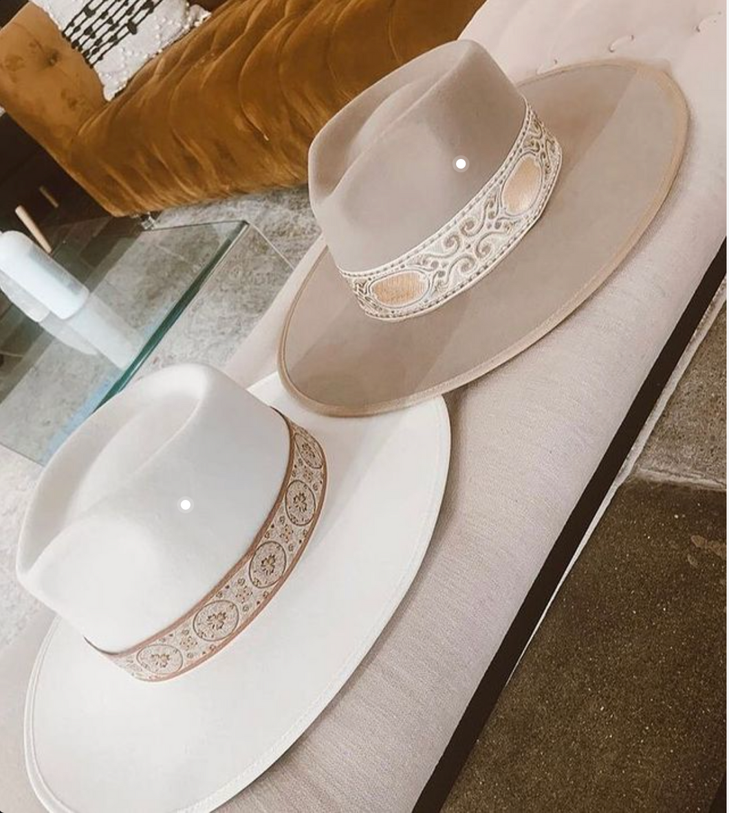 Wool rancher with decorative band, adjustable inner velcro strap for sizing and lining.