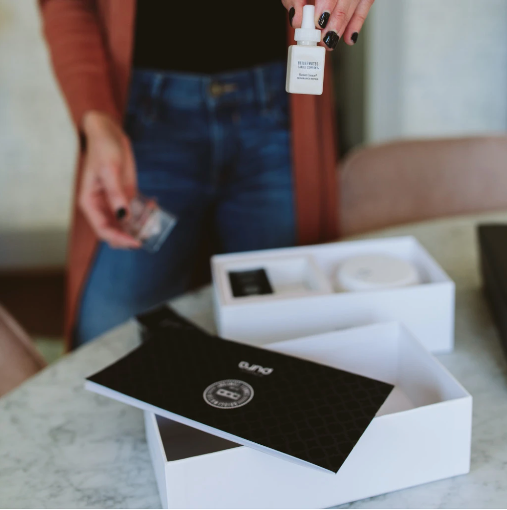 This Smart Home Fragrance Diffuser powered by Pura allows you to fill your home with two of Bridgewater's best-selling fragrances. Once you plug in and set up your diffuser using the Pura app, you can then control your device from virtually anywhere and set custom schedules to suit your lifestyle. Kit Includes: One Smart Home Fragrance Diffuser Powered by Pura One Sweet Grace Fragrance Vial: With exotic passion fruit, sparkling tea and classic patchouli, Sweet Grace is undeniably warm, peaceful and pure. One Afternoon Retreat Fragrance Vial: Sink back into a bed of soft moss, teak, sandalwood and amber as a light, refreshing breeze of bergamot and lime sweeps through the air.