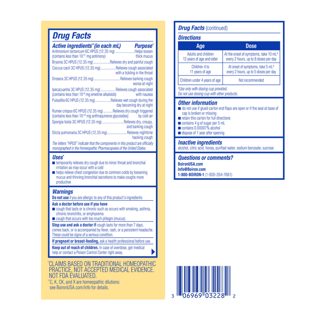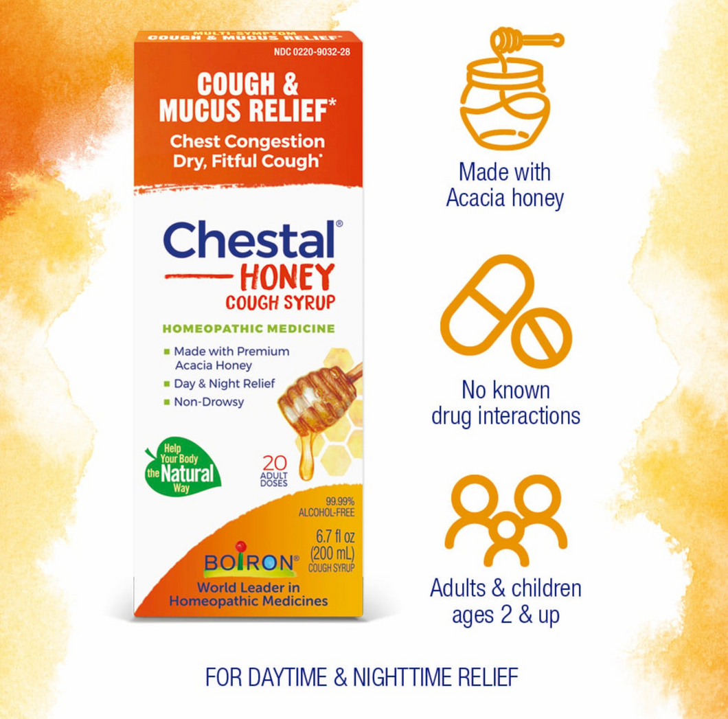 Boiron Chestal Honey combines homeopathic medicines that traditionally treat different types of coughs with the goodness of real honey to soothe the throat. This multi-symptom cough syrup loosens chest congestion with no worry of interaction with other medications.*
