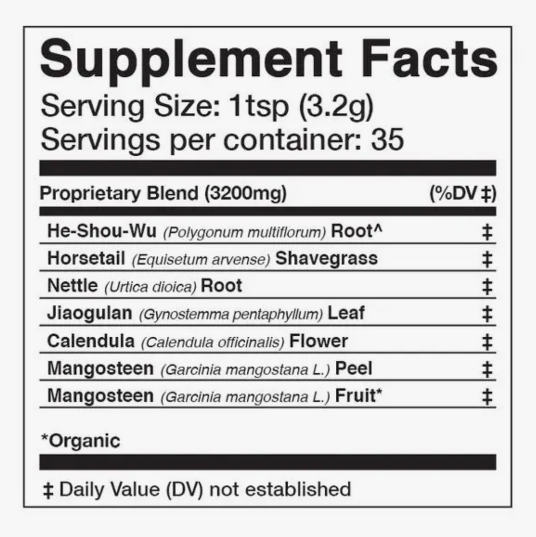 VEGAN | GLUTEN FREE | MADE 100% FROM PLANTS This plant-based blend is the ultimate beauty boost — this formula of adaptogens, ancient herbs, and flowers help to support radiant hair, glowing skin, healthy nails, and may aid in repairing and restoring body tissue. Our plant based collagen is an easy to use, bio-available extract powder. Key Benefits: + May help boost the body’s natural production of collagen and keratin. + May restore and maintain the skin’s youthful glow. + Can increase the potential for thicker, stronger hair. + Helps to add elasticity to the skin, joints, and ligaments. + May increase the strength and healing of bones and cartilage. INGREDIENTS: He Shou Wu extract powder^, Horsetail extract powder^, Gynostemma, Nettle*, Calendula*, Mangosteen Fruit*, Mangosteen Peel*. *Organic