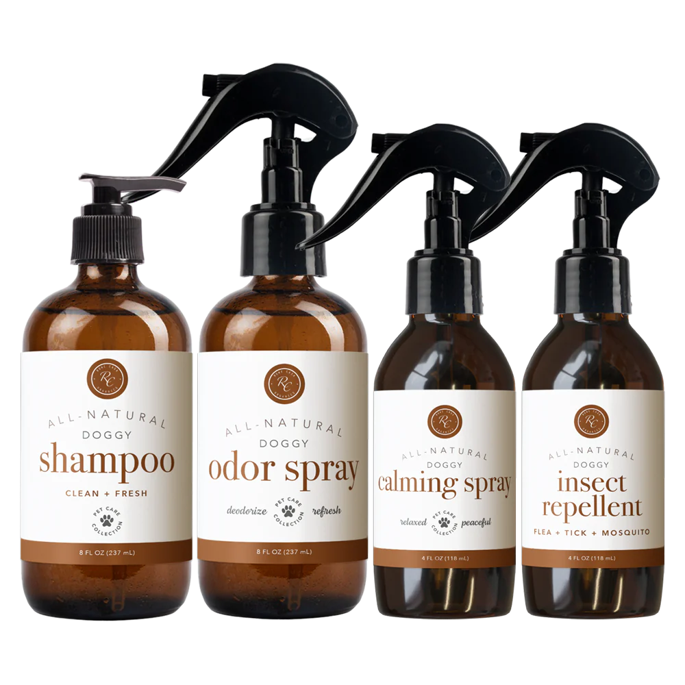 Insect Repellent: This gentle and effective spray is formulated to safely protect your canine companion by repelling pesky critters such as fleas, ticks, and mosquitoes all year round. Ingredients: DISTILLED WATER, DISTILLED VINEGAR, 100% PURE THERAPEUTIC GRADE ESSENTIAL OILS: CITRONELLA, PEPPERMINT, EUCALYPTUS, LAVENDER, CEDARWOOD, GERANIUM.