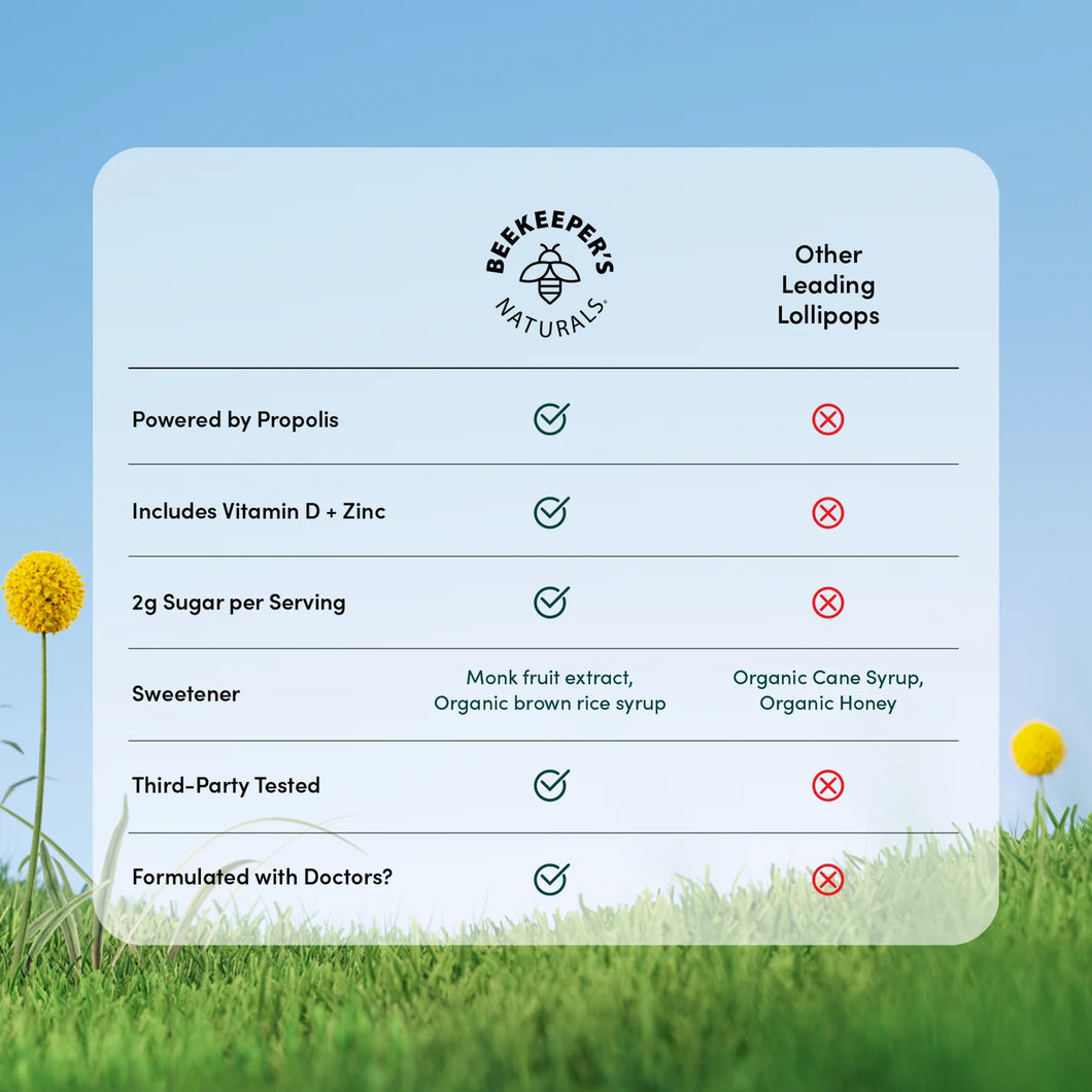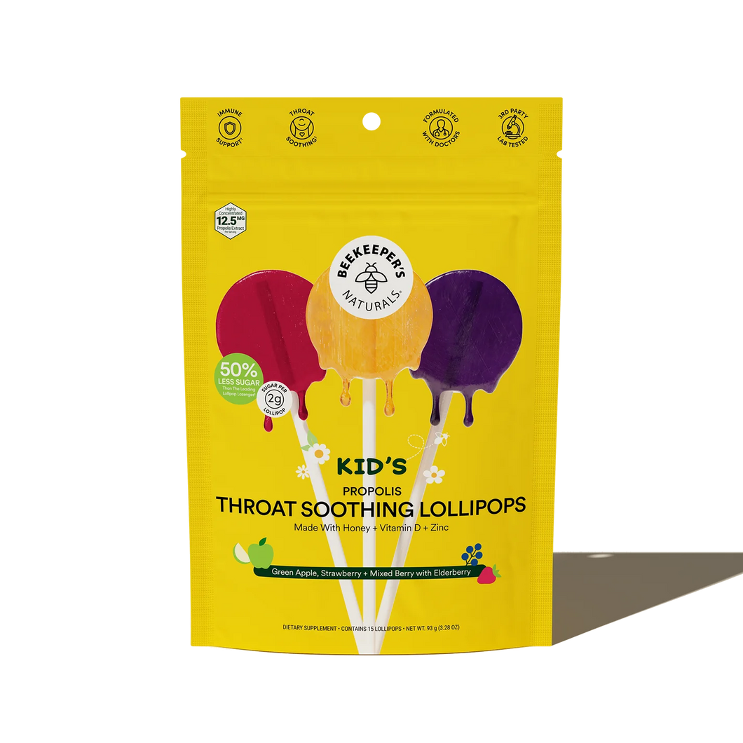 Our best-selling lozenges, now in a kid-friendly lollipop. Each lollipop is formulated with Propolis Extract, Vitamin D, Zinc, and Wildflower Honey to soothe scratchy throats and support immune systems. They’ll never know it has 50% less sugar than the leading lollipop lozenge.