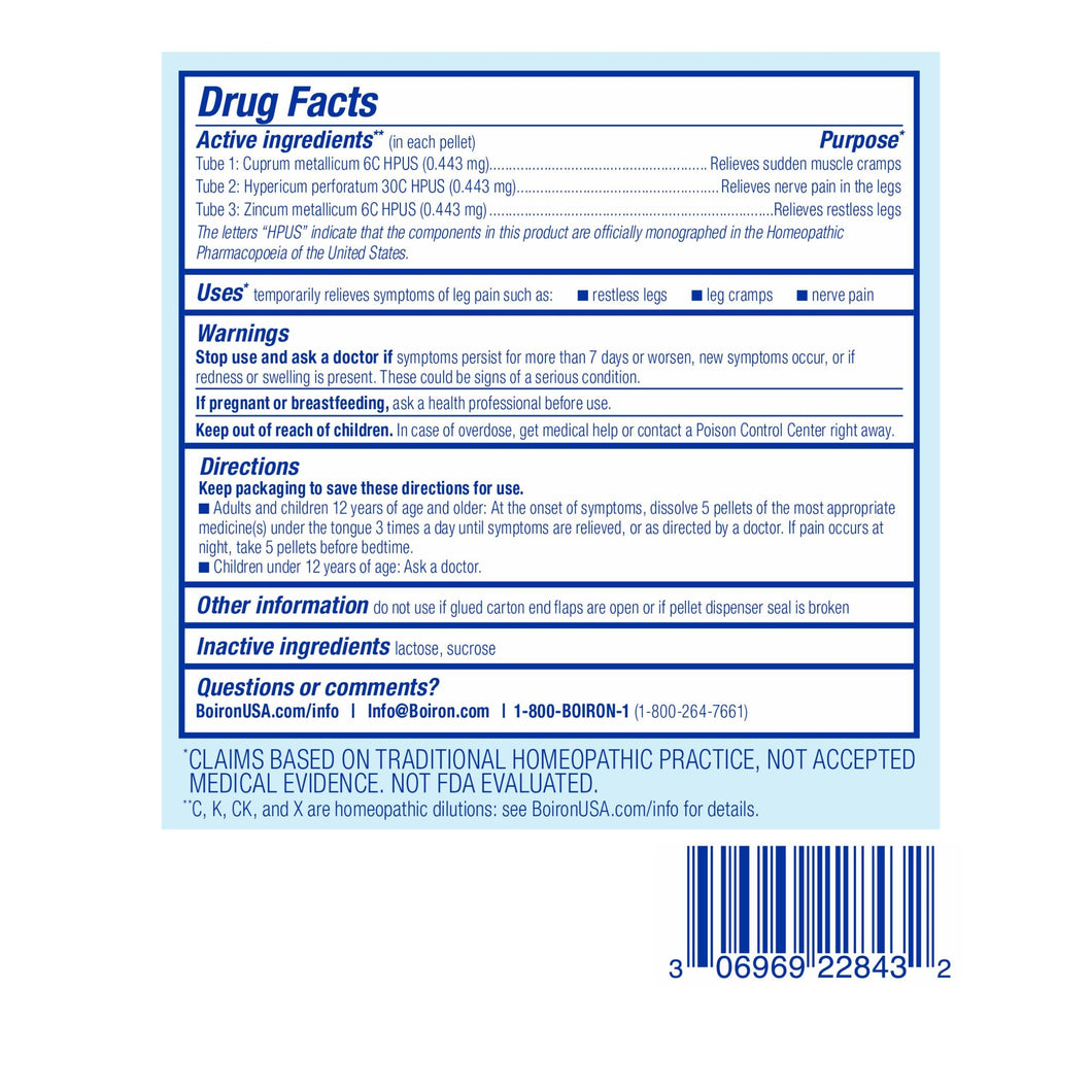 Boiron Leg Pain Relief Care Pack provides three separate homeopathic medicines that relieve three types of leg pain: restless legs, leg and muscle cramps, and shooting pain.* For day and night use, these meltaway pellets are convenient to take without water before bed, when awoken by a cramp, or before, during or after exercise.