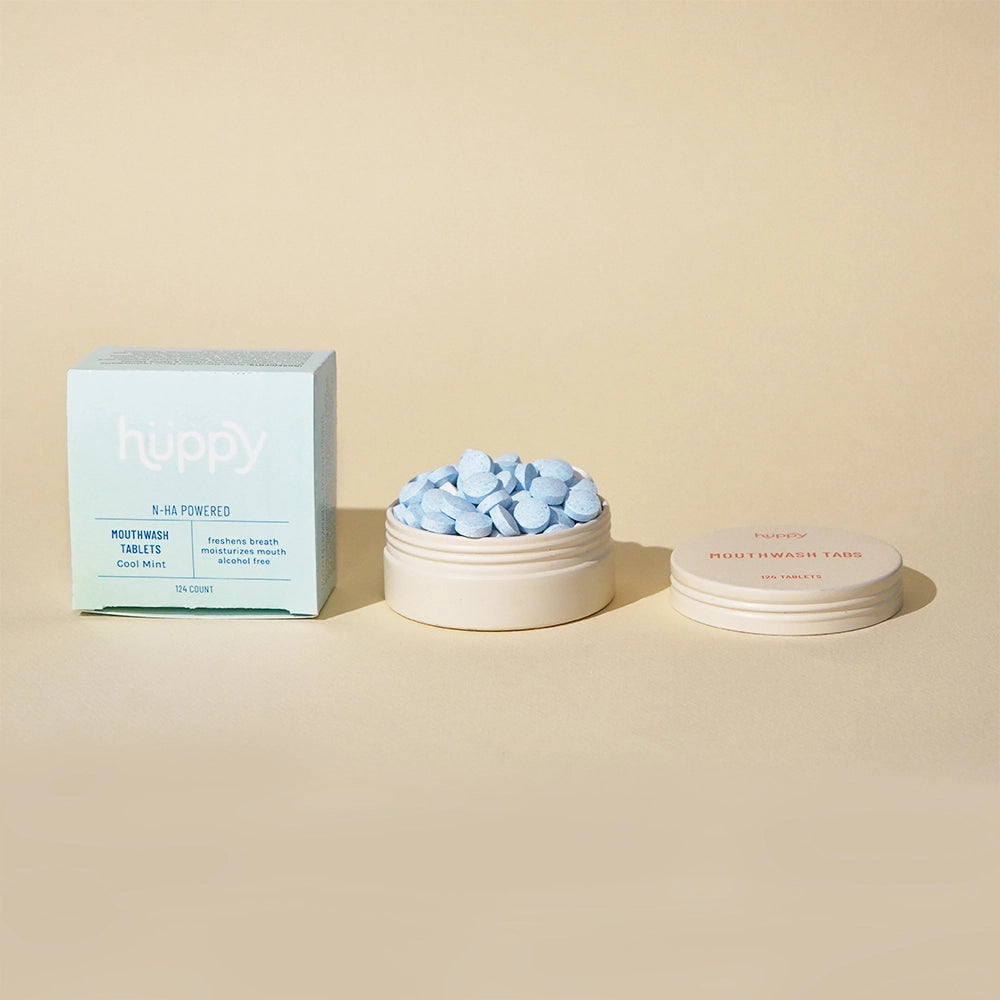 Huppy Mouthwash Tablets made with Cool Mint have completely eliminated the need for plastic bottles that contain harsh ingredients and mostly water. Our mouthwash tablets fight bad breath while at-home or on-the-go and balance the mouth's pH levels. Our mouthwash tablets are made with clean ingredients like peppermint oil, eucalyptus oil, coconut oil and xylitol, and contain nano-hydroxyapatite, a non-toxic fluoride alternative that remineralizes tooth enamel & helps fight sensitivity. - 124 Tablets - Aluminum Refillable Case - Clean Ingredients - Dissolves Quickly - Plastic-Free
