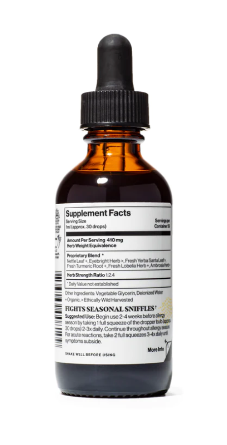 Spring Defense Tonic (previously Allergy Defense Tonic) is a natural herbal formula designed to keep you bright eyed and breathing easy so that you can enjoy your Spring days with ease. This blend works hard to keep your nasal passageways feeling open and clear by supporting a normal, healthy response to pollen and environmental irritants. Spring Defense Tonic supports us at the root by maintaining normal histamine metabolism as the grass gets greener and flowers start to bloom — so you can continue feeling your best during pollen season and beyond.*