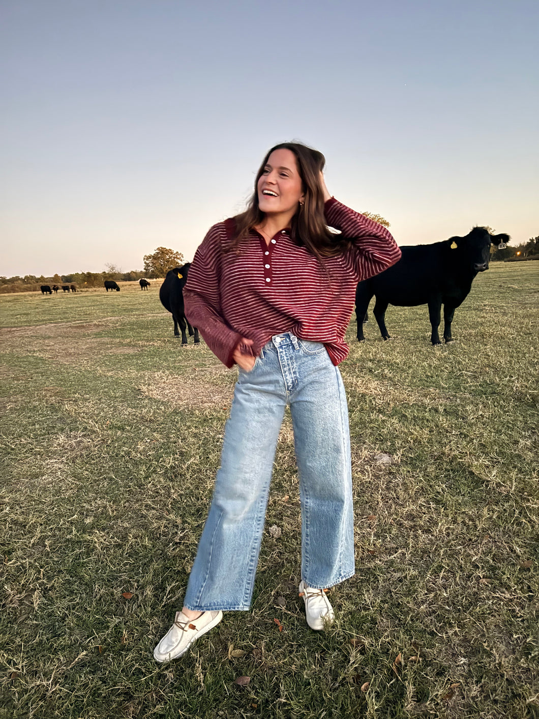 Add a splash of fun to your wardrobe with this wine-colored stripe knit pullover polo. Its cozy knit fabric feels soft against your skin while the vibrant stripes bring a playful twist to a classic style. Perfect for layering or wearing on its own, this top combines comfort and charm effortlessly.