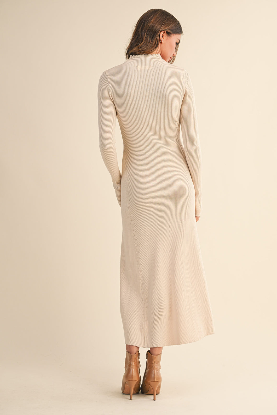 Step out in style with The Amber Dress, a playful take on classic elegance. Featuring a cozy mock neck and long sleeves, its rib knit fabric gently hugs your silhouette while the flared midi skirt adds a twirl-worthy finish. Perfect for turning heads whether you're brunching or dancing the night away, this dress combines comfort and charm effortlessly.