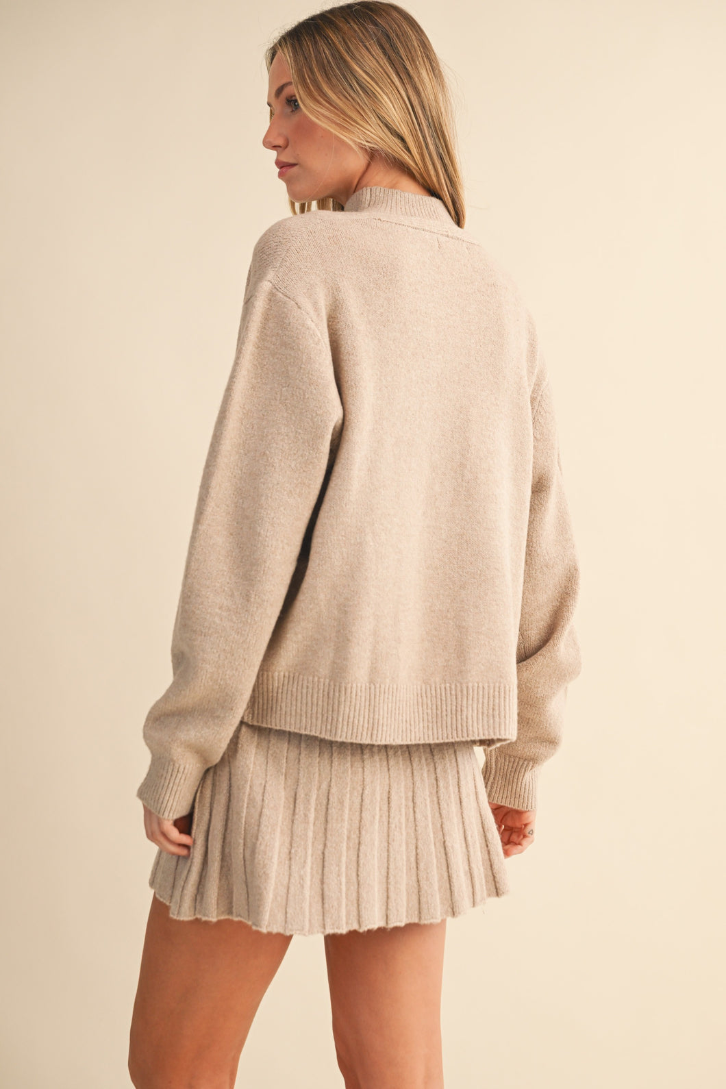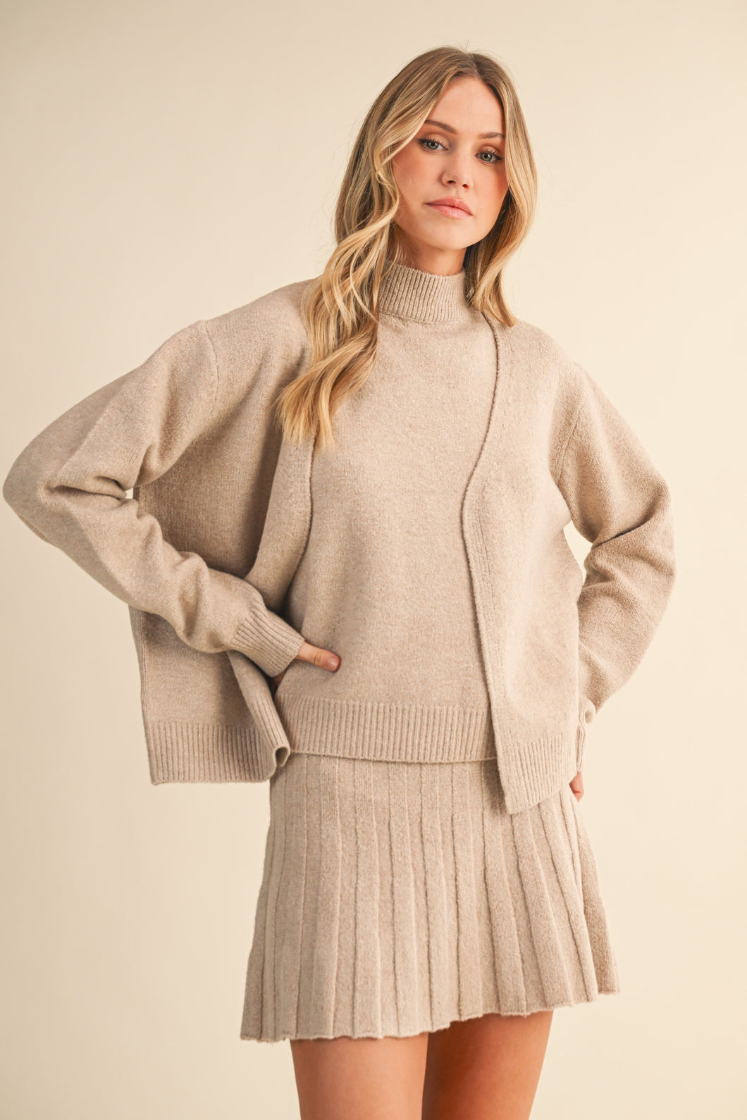 Elevate your style with this charming three-piece set featuring a cozy mock neck top, a cute cardigan, and a flowy pleated skirt. Perfect for mixing and matching, this combo adds a playful twist to your wardrobe while keeping you comfortable all day long. Whether you're headed out or staying in, this set brings effortless flair with every wear!