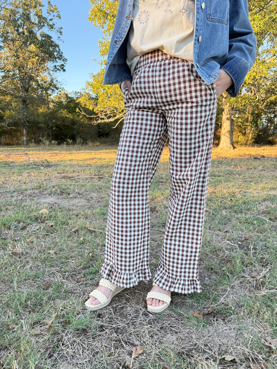 Step into charm with The Hayden Pants, featuring a delightful brown gingham check pattern and playful ruffle cuffs that add a flirty twist to your look. Perfect for mixing comfort with a touch of whimsy, these pants bring a fresh, fun vibe to any outfit.
