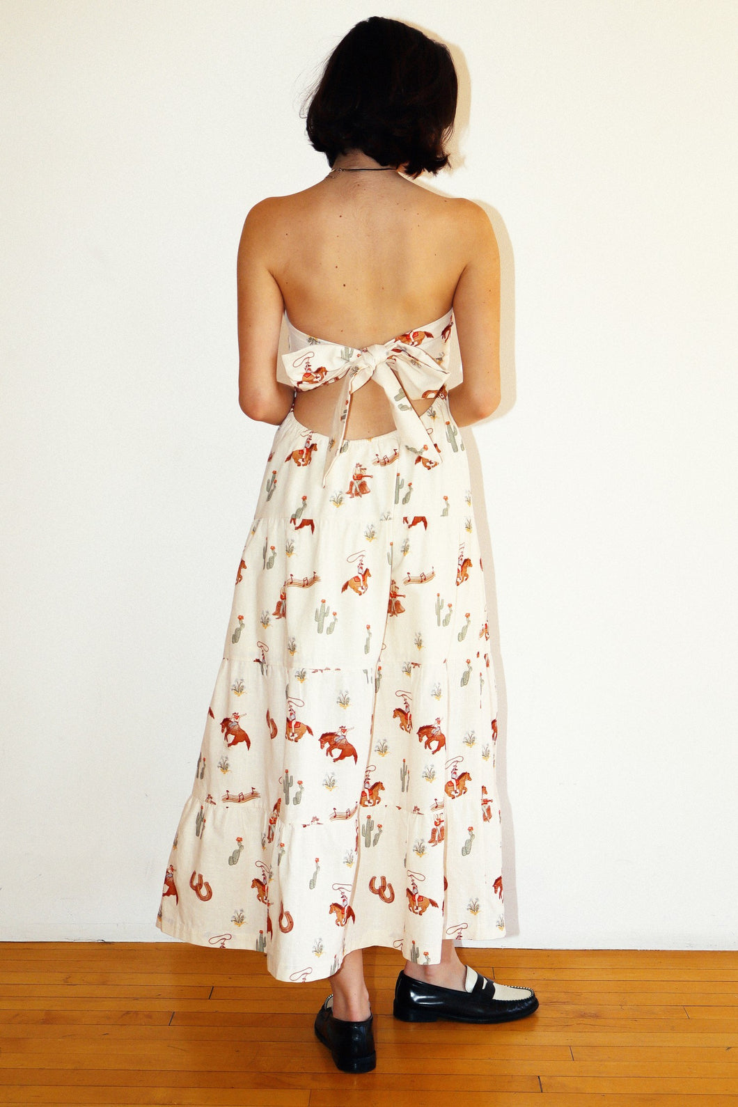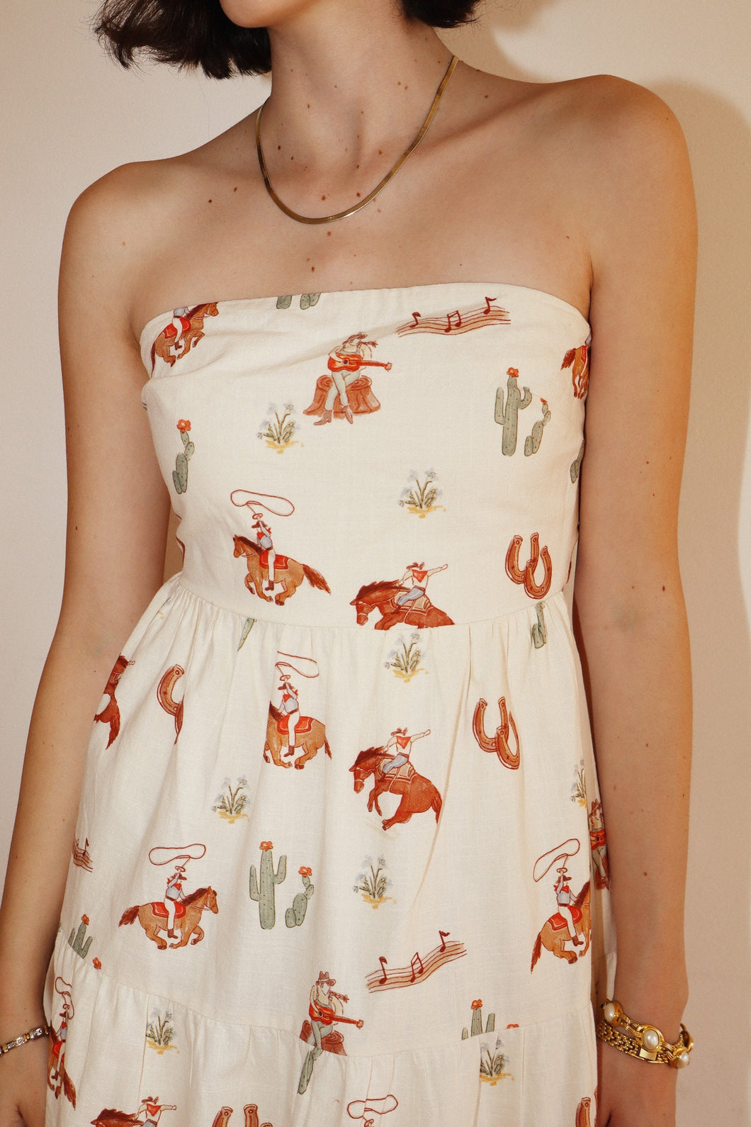 Saddle up and stand out in The Wild West Dress! This strapless rodeo dress is sure to turn heads with its unique open back design. Perfect for any cowgirl looking to add a touch of edginess to their outfit. (No exclamation points needed, the dress speaks for itself.)
