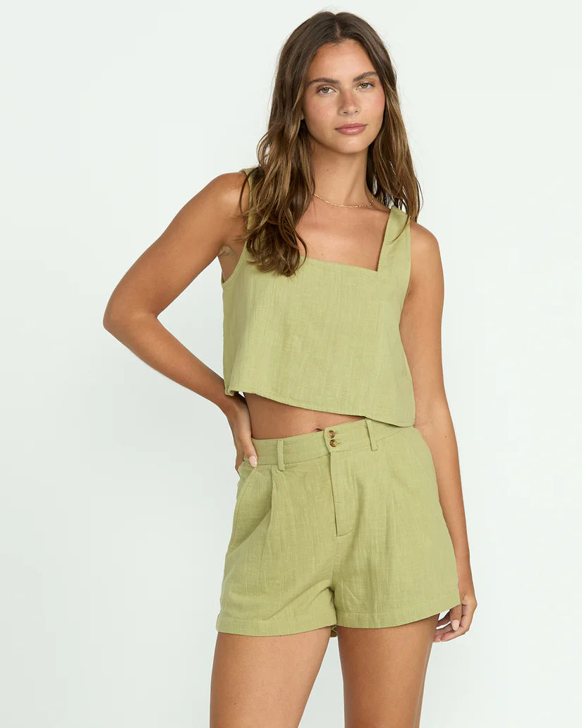 Light as a sea breeze, these 100% cotton shorts and matching top bring beachy vibes wherever you go. The cotton tank features a cropped, square neckline and metal accent. While the shorts have a  soft double-slub gauze  with an elastic back waist for comfort, and the button fly lends a polished look. This set is perfect for warm weather.  Featured here in the Green colorway.